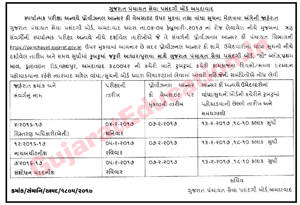 GPSSB Nayab Chitnis and Other Exam Official Answer key Related Notification 2017
