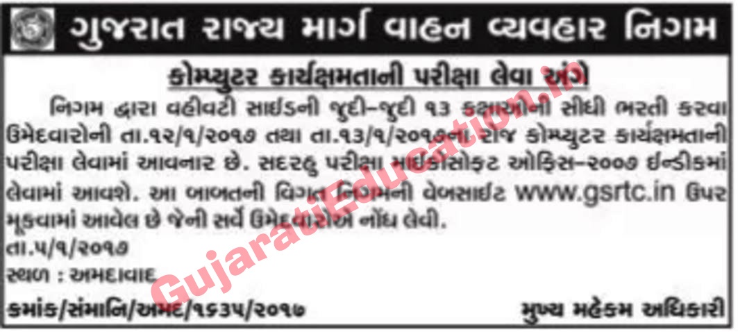 GSRTC Computer Related Important Notification 2017