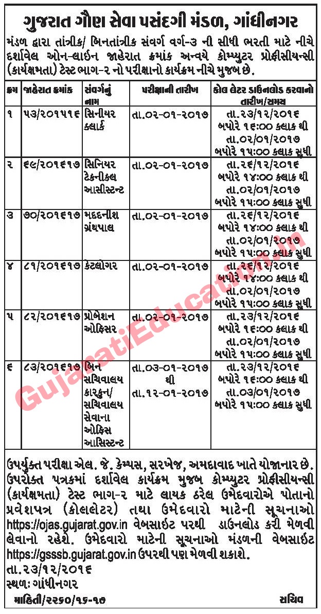 GSSSB Bin Sachivalay Clerk and Office Assistant Post Computer Exam Call Letter 2016