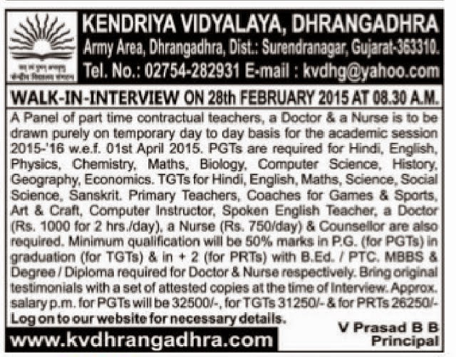Kendriya Vidyalaya Dhrangadhara ,Teachers Recruitment 2015 February 22, 2015 by Gujarati Education Official Notification : Click Here Website : Click Here Advertisement: આ પણ વાંચો Rojgar Samachar (11 February 2015)